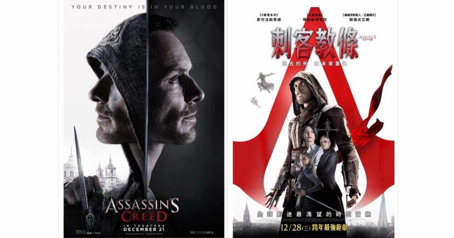 【附圖:Assassin's Creed (刺客教條) 的 English 版海報之一及中文版海報之一 / 圖片採自網路】