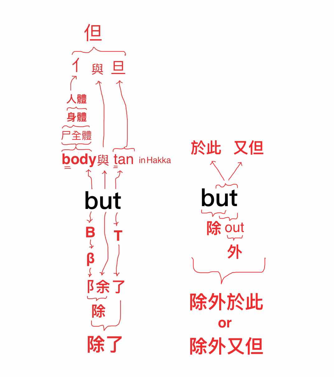 bu + t = Β余 + 了 = β余 + 了 = 阝余 + 了 = 除 + 了 = 除了 = but,直譯也可以是「除了」,又意通「不過無此」或「但是無此」。並且,若參考清代陳昌治刻本《說文解字》記載「桮,㔶也。从木否聲。『匚否』,籒文桮。布回切。」,可知「否」聲又類似「布回切」的發音,即類似有「bù-huéi 切」的發音方式而可能有 buéi 的發音,和台閩語表達「不」或「否」的ㄧ種發音 buéi 完全相同。換句話說,若 but 之 bu 即來自「否」的 buéi 式古音之起音 bu,則 but 亦可能直接具有或橋接於「否定」二字之意,此外或也有「未定」(還不一定) 之語意。