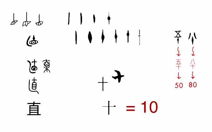 【附圖:「直、十、10」字形演化 /  我們可以發現到現代數學中的數字符號 10 也帶有部份甲骨文及金文字體之符號「丨結 」的感覺,只是將符號「丨」的重疊組合改成形似符號「丨〇」的並排組合。】