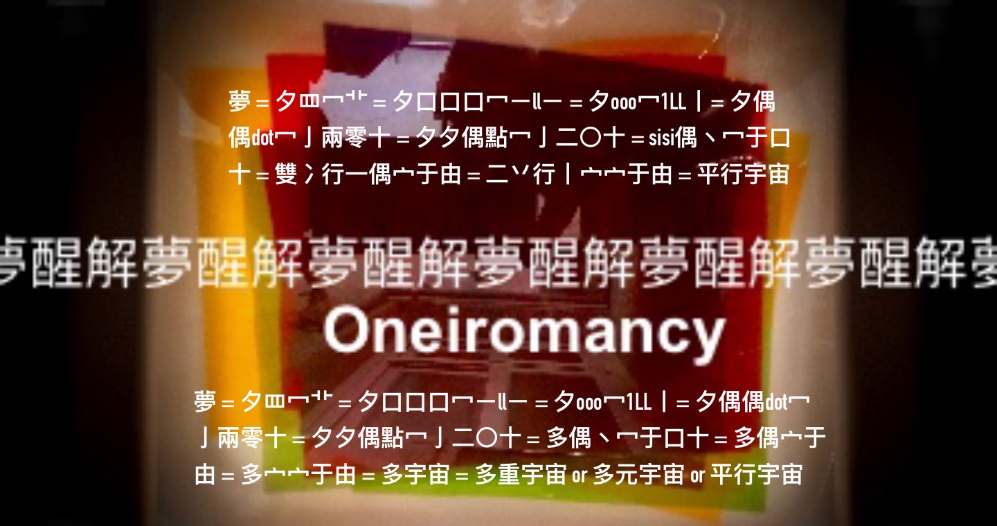 夢 = 夕罒冖艹 = 夕口口口冖ㄧllㄧ = 夕ooo冖1LL丨= 夕偶偶dot冖亅兩零十 = 夕夕偶點冖亅二〇十 = 多偶丶冖于口十 = 多偶宀于由 = 多宀宀于由 = 多宇宙 = 多重宇宙 or 多元宇宙 or 平行宇宙,其中「多」字可能以兩個符號「夕夕」的組合約略象徵意會「多重」、「多元」或「平行」的概念,符號「丨」則是漢字「十」的殷商甲骨文或金文字體之一。(P.S. 參考【附圖:「十、10」字形演化】)