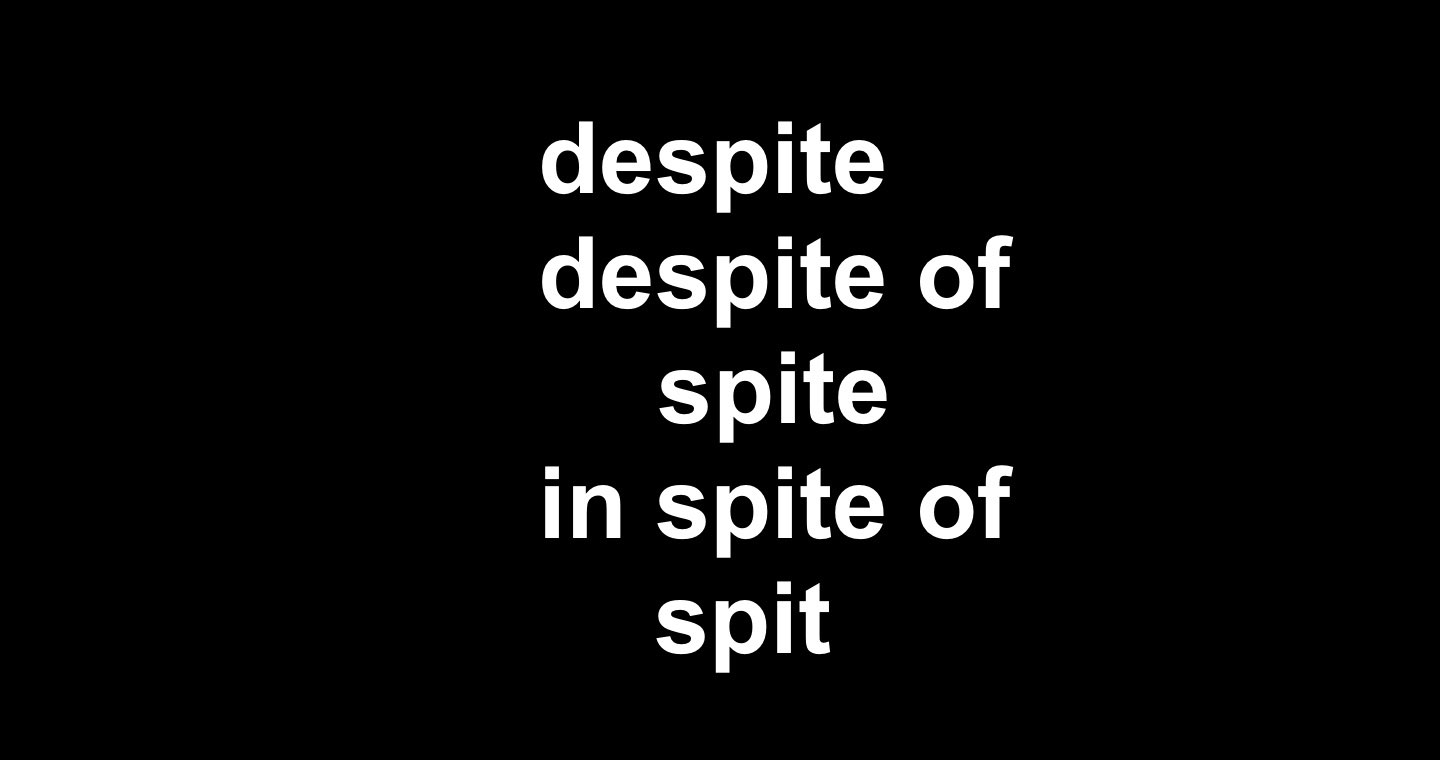 despite = decade圓雙朋ite = 十〇二iteite = 十口二1threeE亻Teye = 車丨三l三人ㄒ目 = 車丨二一L三儿示目 = 車工一ㄑ三儿礻目 = 車工一ㄑㄑㄑ視 = 車工一巛視 = 車巠視 = 輕視,類似「小看」、「看輕」、「看貶」、「看低」、「看不起」、「視為不重要」之類。此時又類似 despise 之意,但 despise 是作爲動詞使用,而 despite 一字的複雜性也就由此而展開。