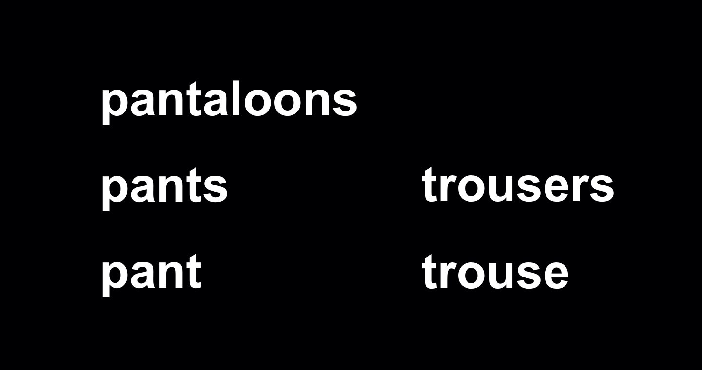 trousers:貼身下衣冗式、貼身裳冗式,其中「冗」意通「長」;臀繞管聯下衣冗式、臀繞管聯裳;褲冗式;褲子冗式;褲子 (trousers = three广口與豎衣round十 = 三广口與丨衤〇十 = 庫衤口十 = 褲子),亦即 trousers 也有可能是將古字 trouse 的「褲」之意加了一個「子」而意指「褲子」;長褲子,此時字首 t 同時約略形聲台閩語「長」的起音,這是 English 本土對「褲子」或「長褲」這種服裝的說法,尤其是指男性穿著的長褲,但其實目前褲子的長短不一,有些褲子看起來甚至是半長不短的,很難區分是長褲還是短褲,而且不一定男女性穿着的褲子式樣有很大的區別。