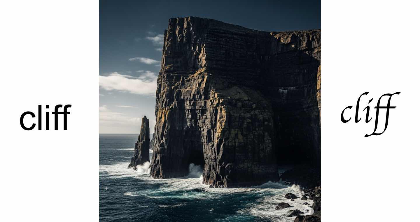 cliff = klif (約略的實際發音) = 月littleㄧF = 月小E = 月⺌山 = 肖山 = 峭,意通漢字「山峻」、「峻」、「陗」、「巖」、「嶮」等。其中 c 發音 k 而約略形聲台閩語「月」的起音,或是以 c 約略象徵彎月狀而轉換漢文「月」;漢文「小」的象形文本是三個點狀符號,所以其中的「小」也能橋接於漢文「⺌」;「一F」構成 E 再以 E 倒時針轉 90 度而約略象徵漢文「山」。